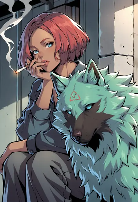 외모: 1소녀, 검은 피부, 검은 피부를 가진 여성, 빨간 머리, 단발, 파란 눈, 입술, 앞머리