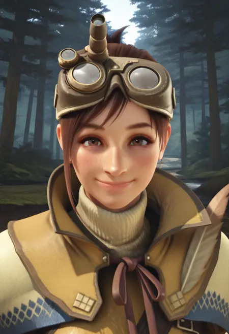 프롬프트: mhwhan, 고글, 1girl, 머리에 고글, 갈색 머리, 갈색 눈, 리얼리스틱, 3D, 두더지점, 시청자 바라보기, 터틀넥, 손가락 없는 장갑,