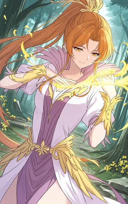 Guan, solo, long hair, orange hair, side bangs, tied back hair, high ponytail, orange eyes,