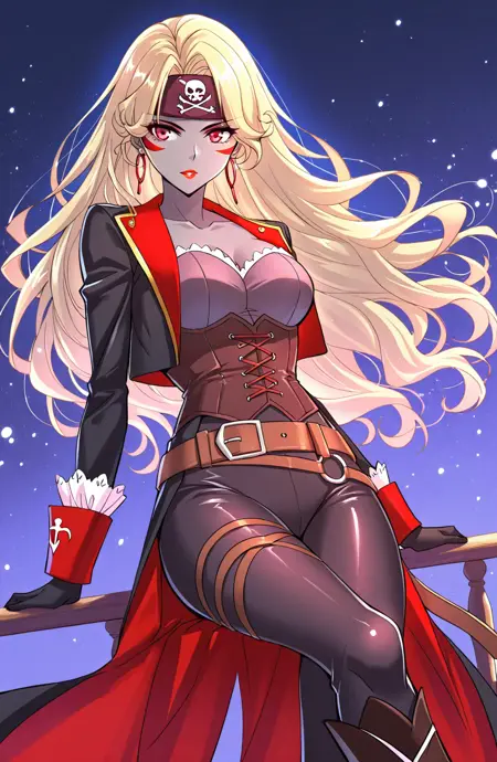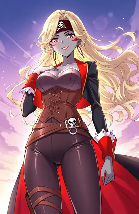 | 학습된 단어 | Zhenzhu, 1girl, solo, long hair, blonde hair, wavy hair, side part, swept bangs, red eyes, grey skin, lipstick, pirate bandana, skull symbol, face markings,복사됨! crimson_captain, black bodysuit, strapless bodice, scalloped neckline, corset lacing, tight pants, criss-cross thigh straps, high-heeled boots, p over-the-knee boots, cross strap belt, belt buckle, long coat, black coat, red inner lining, red cuffs, lace cuffs, earrings, white scalloped neckline, white lace cuffs, frilled cuffs,복사됨! |