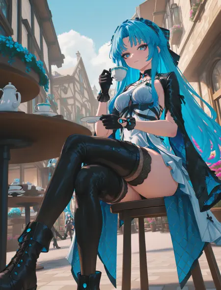 Carlotta, long hair, dress, thighhighs, boots, blue eyes, grey hair, red jacket, black gloves, masterpiece, best quality, newest, absurdres, highres, very awa