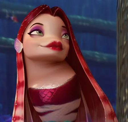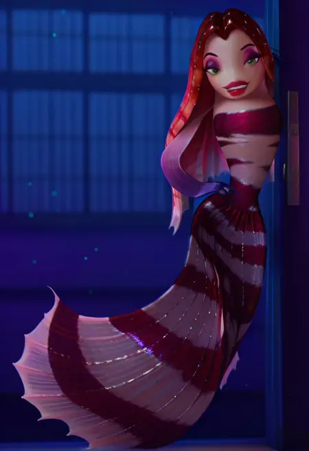 • LolaSharkTale, 1girl, solo, green eyes, fish girl, makeup, red lips, lipstick, purple eyeshadow, long hair, red hair, multicolored hair, sparkling scales, fins, hand-like fins, narrow waist, striped scaly body, underwater, smooth skin