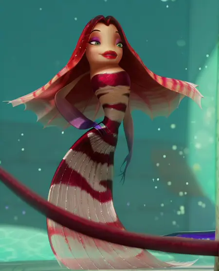 - LolaSharkTale, 1girl, solo, green eyes, fish girl, makeup, red lips, lipstick, purple eyeshadow, long hair, red hair, multicolored hair, sparkling scales, fins, hand-like fins, narrow waist, striped scaly body, underwater, smooth skin
