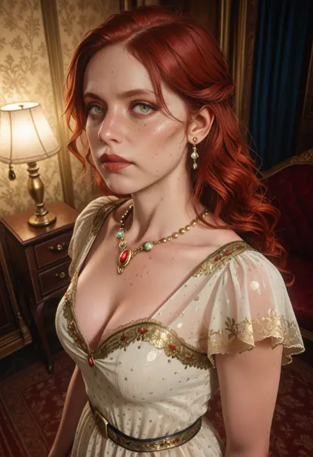 RDR2Molly, 1girl, red hair, green eyes, long hair, freckles