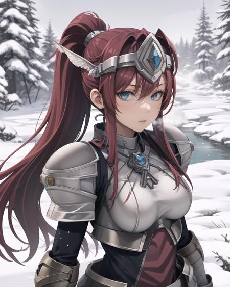 Ines, red hair, long hair, ponytail, blue eyes, medium breasts, armor, armored dress, winged visor, wing ornament, bodysuit, black bodysuit, pantyhose, armored boots, greaves, red skirt, red waistcloak