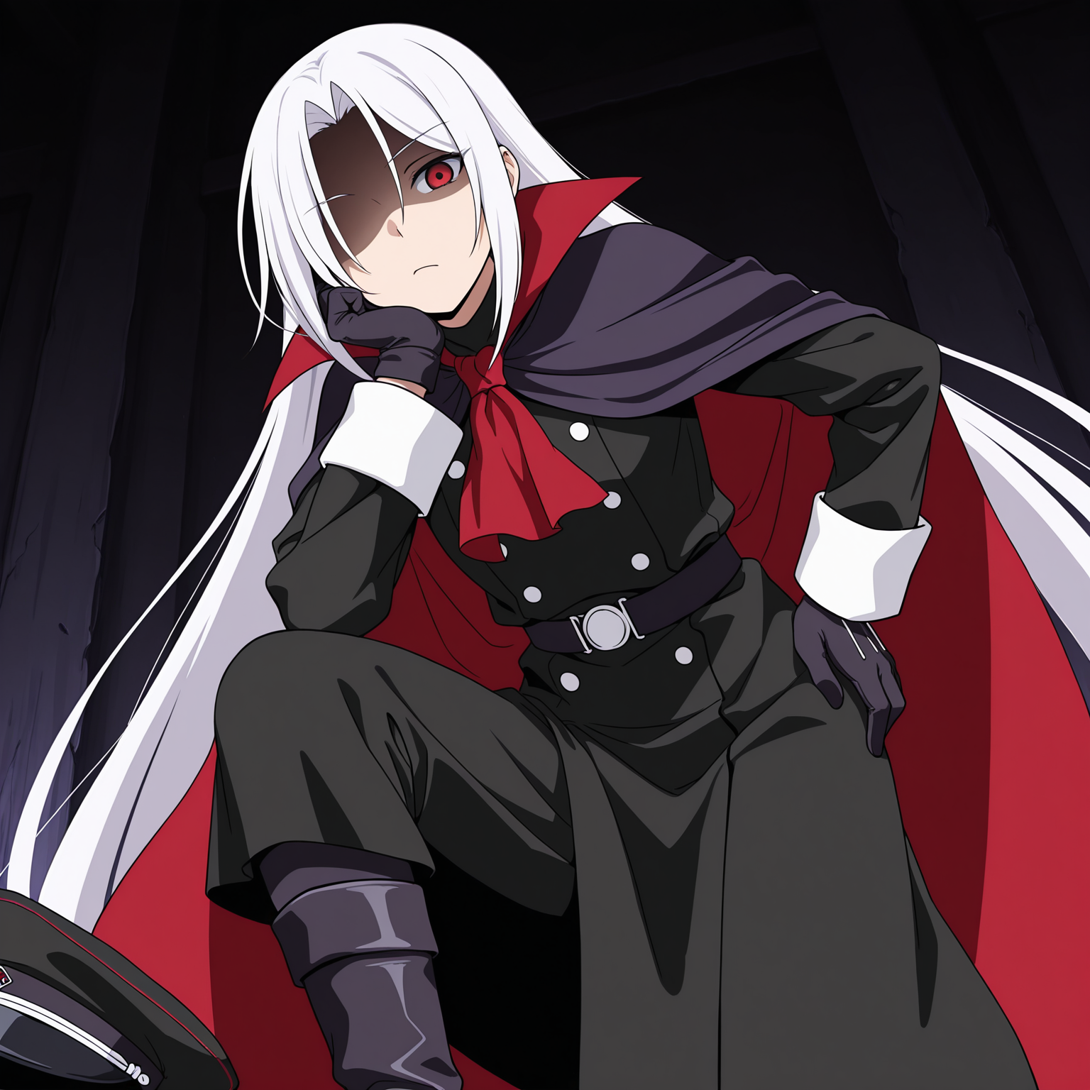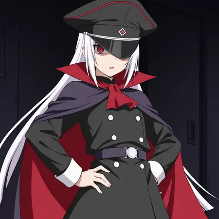 aged up, white hair, long hair, parted bangs, red eyes, flat chest, military uniform, hat, cape, ascot, coat, belt, gloves, pants, boots,