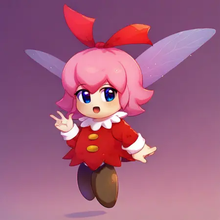 标准装扮:蓝色眼睛,粉色头发,翅膀,仙子,红色丝带,仙子翅膀,红色连衣裙,短发,丝带/卡比