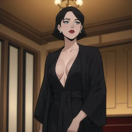 ローブ付きトリガー:SelinaKyleLongHalloween, 1girl, earrings, jewelry, cleavage, breasts, lipstick, robe, dress, makeup, collarbone, short black hair, mature female, red lips, cowboy shot