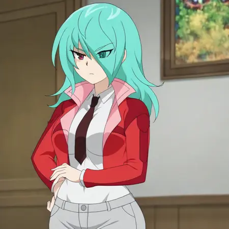 1소녀, 혼자, 여성 초점, 큰 가슴, 큰 엉덩이, 큰 허리, 큰 허벅지, 여성스러운 체형, 속눈썹, 델타 자쿠로, 비블레스트, 비블레스트 라이즈, 비블레스트 스타일, 애니메이션 스타일, 청록색 머리, 긴 머리, 눈 위의 머리, 머리를 통해 보이는 눈, 날씬한 여성, 빨간 재킷, 높은 칼라, 검정 버튼 셔츠, 빨간 넥타이, 회색 바지, 정면 시점, 얼굴 초점, 상세한 얼굴, 상세한 손, 완벽한 손, 5개의 손가락