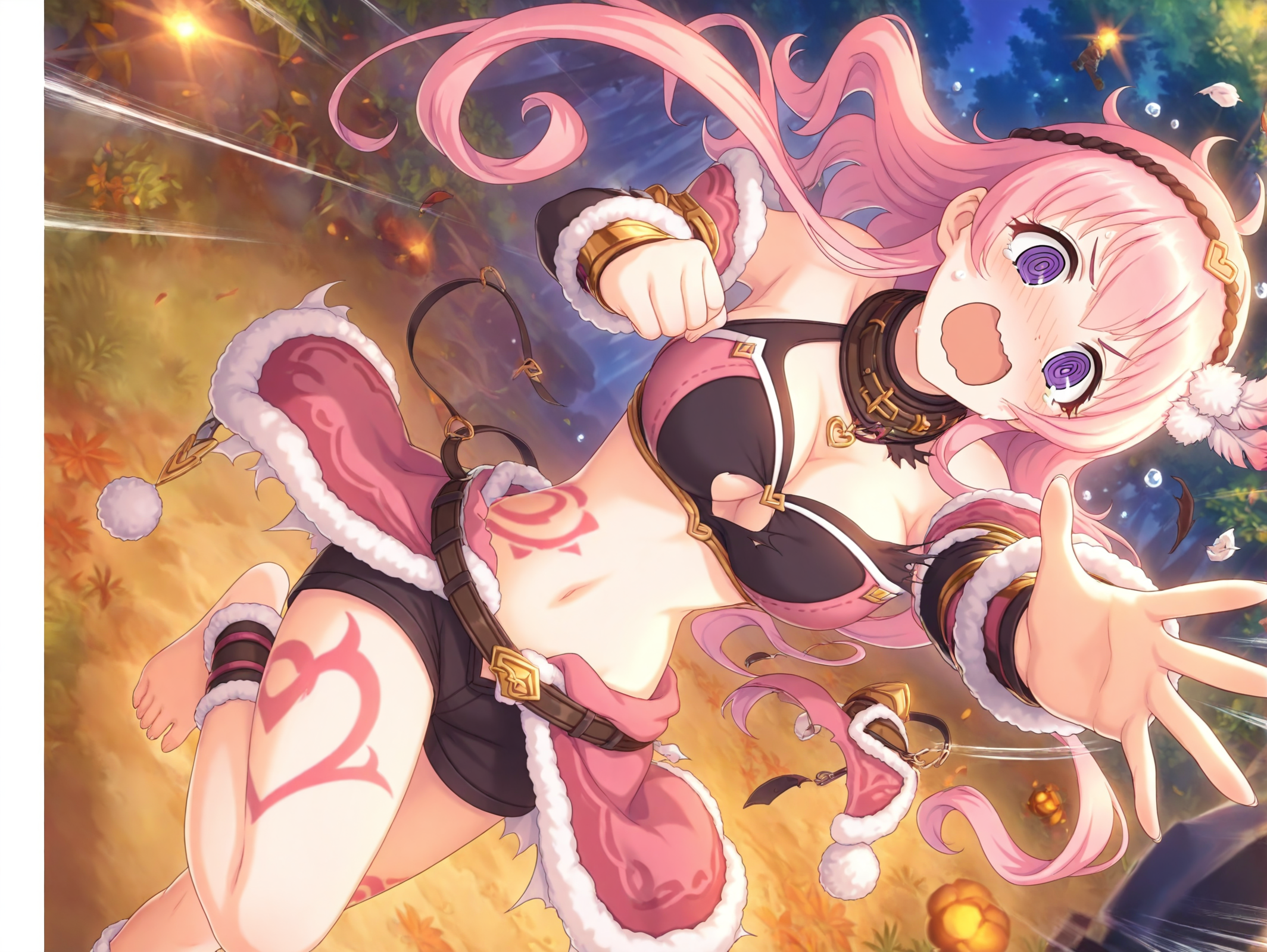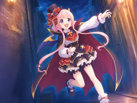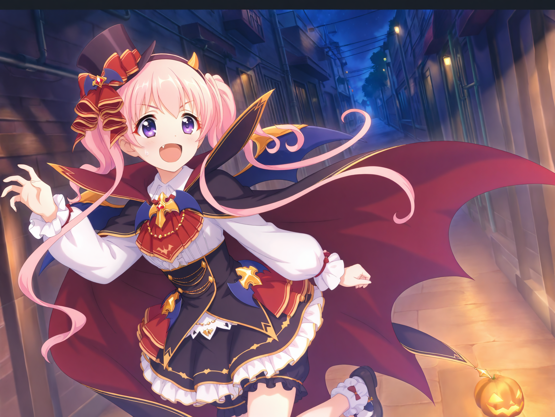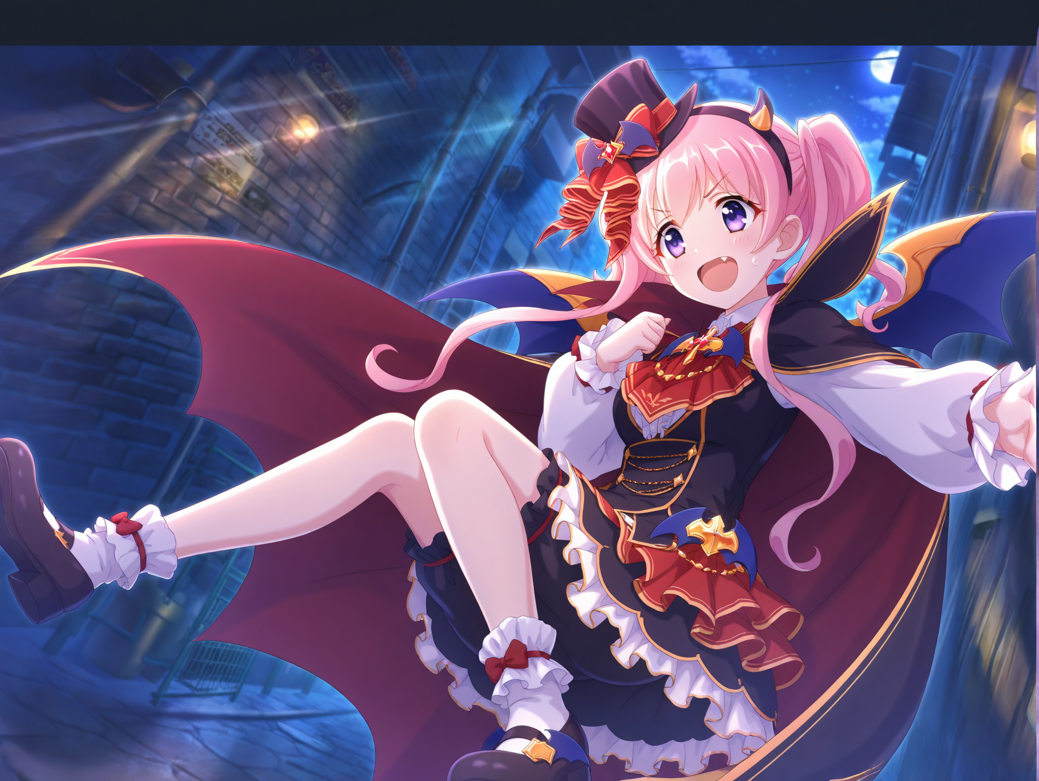 official style,lora:Tsumugi5464:0.9,two-sided cape,1girl,red cape,red ascot,cape,pink hair,top hat,black cape,shoes,long hair,vampire costume,black skirt,long sleeves,bloomers,white socks,puffy long sleeves,purple eyes,frilled skirt,hat bow,red bow,fake horns,fang,blue wings,alley,night,