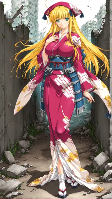 lizna-lamphubitt, blonde hair, japanese clothes, kimono, hat, blue eyes, tabi, breasts, green eyes, large breasts