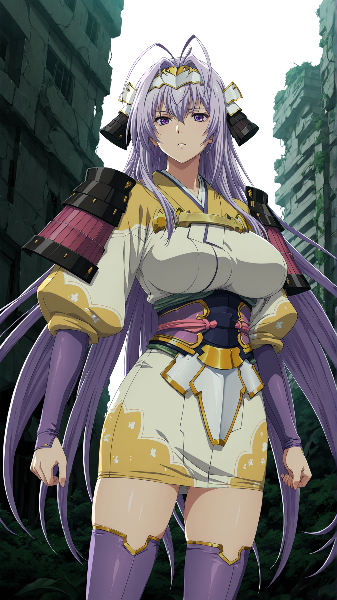 senhime, armor, purple eyes, light purple very long hair, large breasts, japanese clothes, shoulder armor, antenna hair, japanese armor, thighhighs