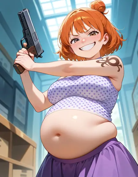 Chocolat, chubby, wide face, short hair, orange hair, single hairbun, brown eyes, wide mouth, nose, polka-dotted top,purple skirt, purple shoes, high heels, large belly, navel, tattoo, large breast, sleeveless,