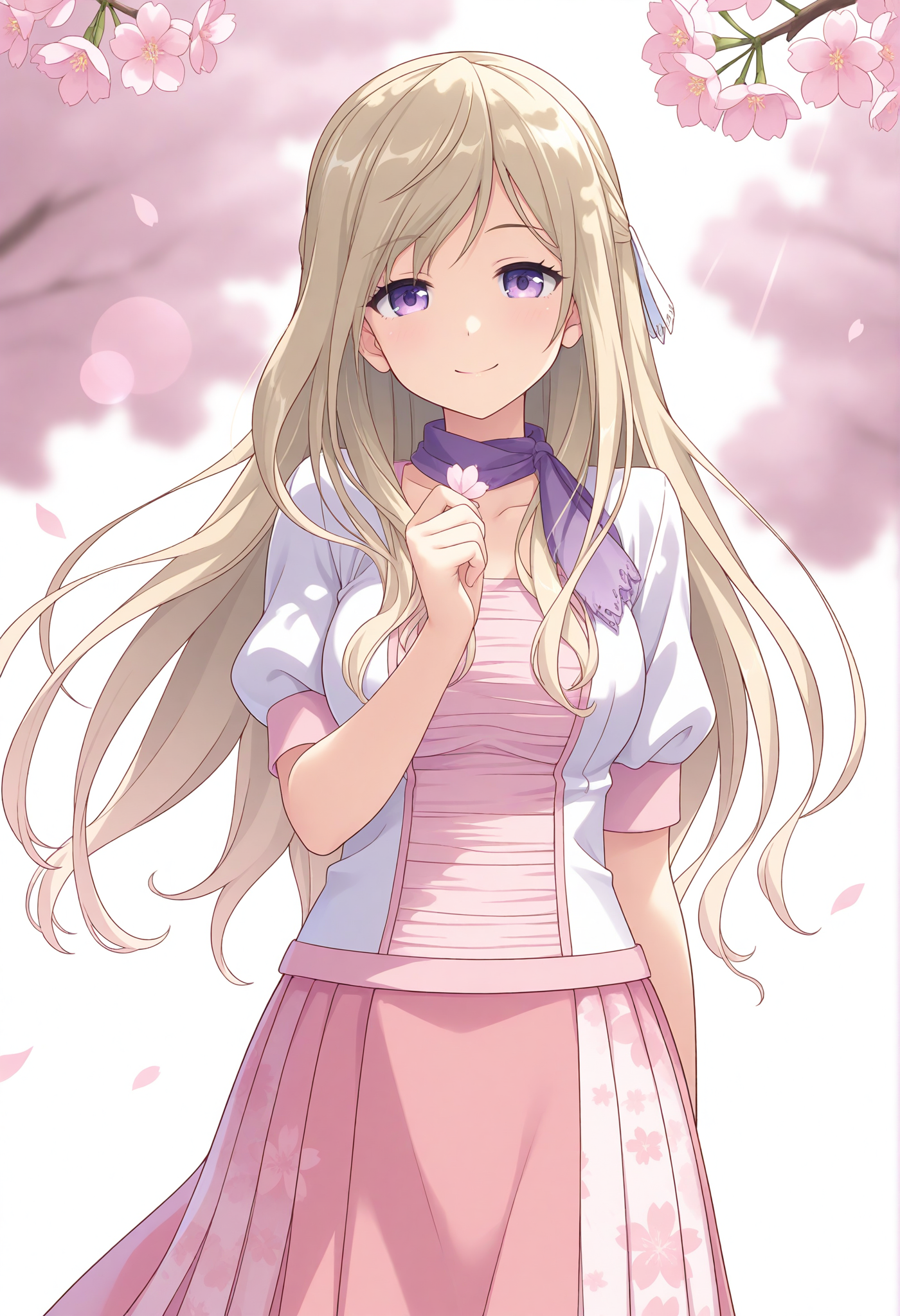 official alternate costume,floral print,pink skirt,long skirt,pleated skirt,print skirt,pink shirt,off-shoulder shirt,puffy short sleeves,pink sleeve cuffs,white jacket,pink trim,open jacket,cropped jacket,purple scarf,