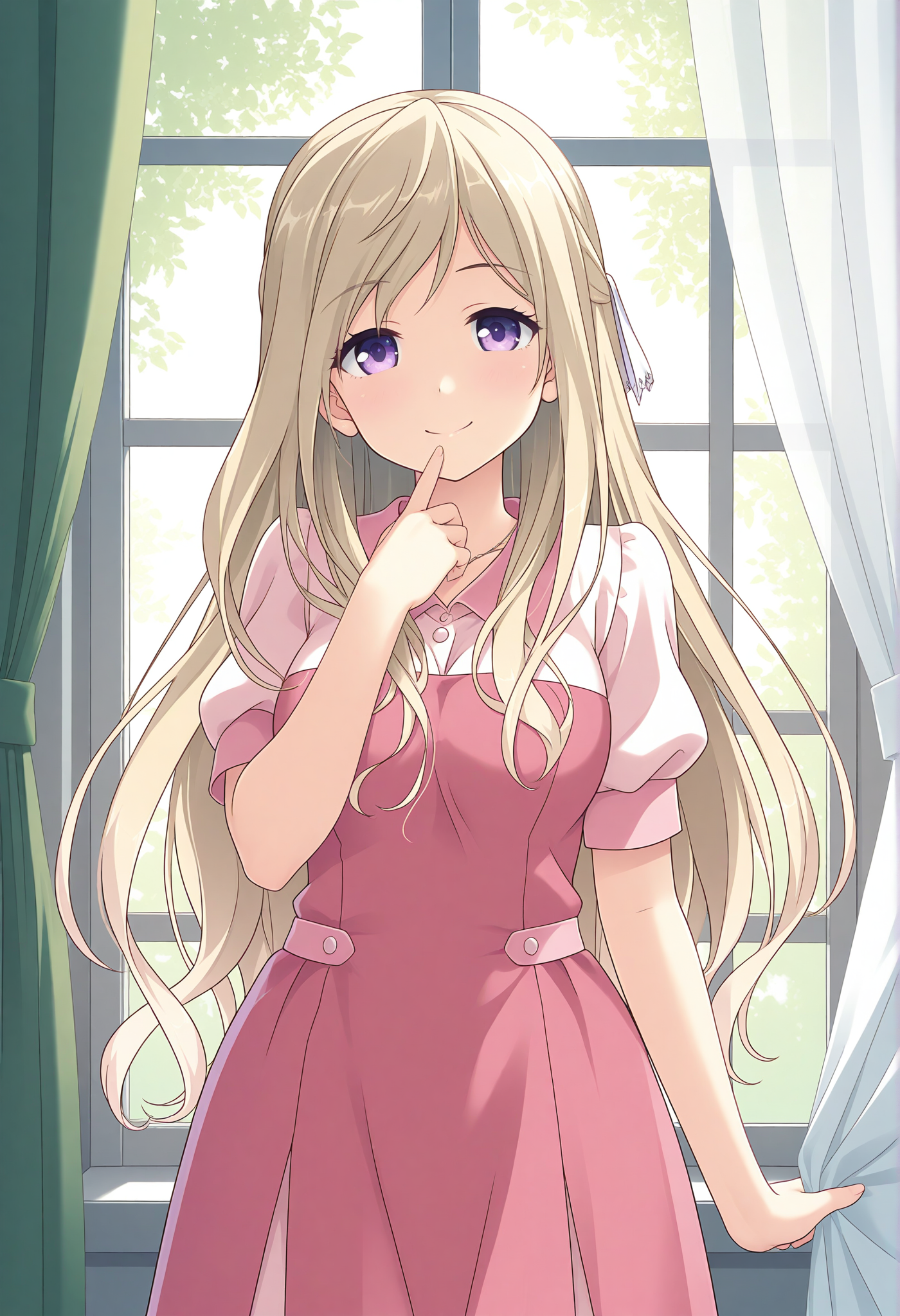 two-tone dress,pink dress,jewelry,white dress,puffy short sleeves,pink sleeve cuffs,collared dress,pink collar,necklace,