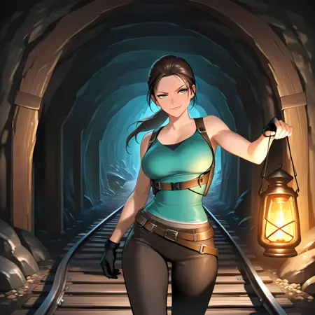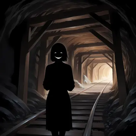 Additional: railroad tracks, indoors, cave, dark, lantern, rock, ceiling light, wooden arch