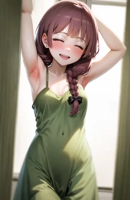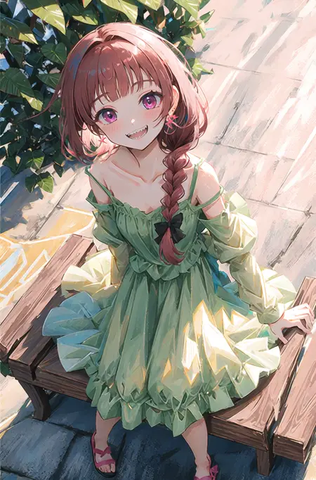 검은 핑크 헤어, 마젠타 눈_ 또는 눈 감기, 땋은 머리꼬리, 리본, 숄더 스트랩 탈락, 앞머리, 긴 초록색 드레스, 벗어진 어깨, 귀걸이