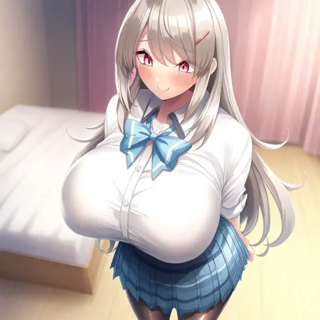 Recommend Prompt:Amane Anesaki, pink eyes, gray hair, long hair, hairclips,