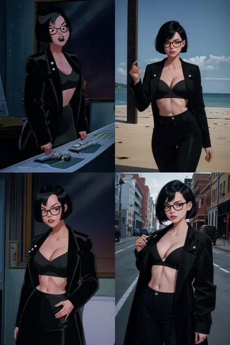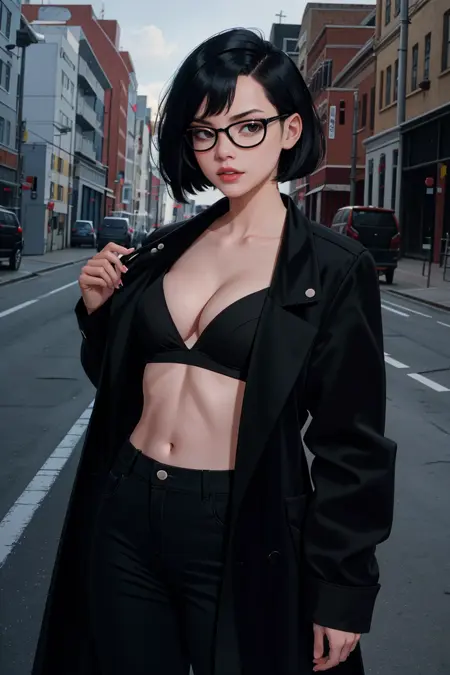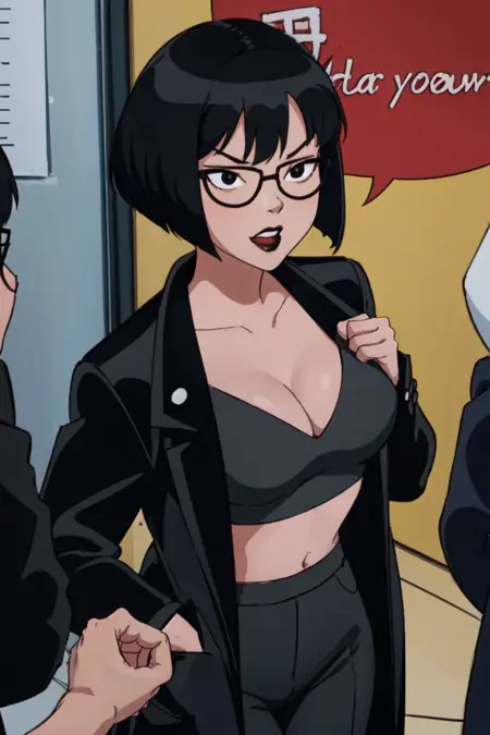 • 黑发,短发,肚脐,黑眼,黑唇,妆容,口红,乳房,圆框眼镜,鲍勃头,刘海,黑框眼镜,