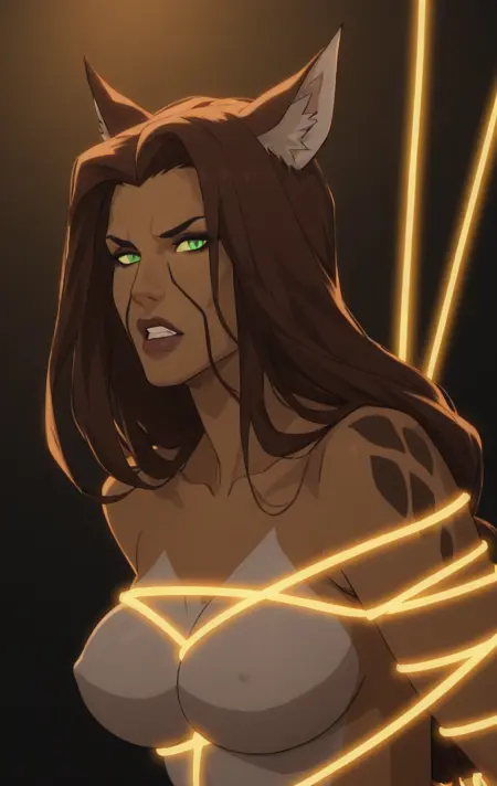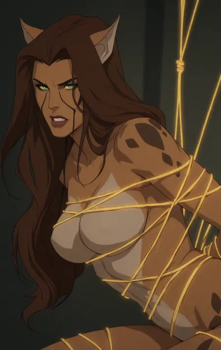 | 학습된 단어 | 1girl, solo, long hair, breasts, looking at viewer, large breasts, brown hair, animal ears, green eyes, medium breasts, parted lips, teeth, cat ears, lips, colored skin, colored sclera, animal print, cat girl, bound wrists, brown skin,ch3et4h,복사됨! |