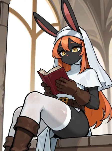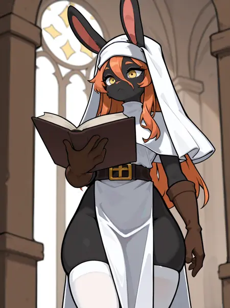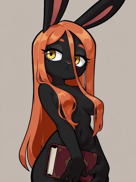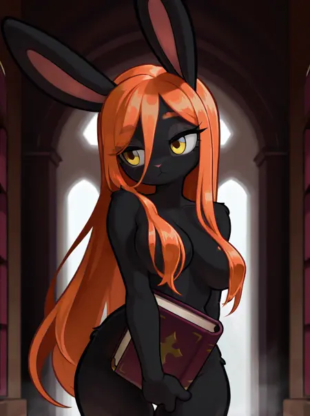 Triggers: lagomorph, anthro, female, eyelashes, orange hair, black fur, yellow eyes, long hair, hourglass figure