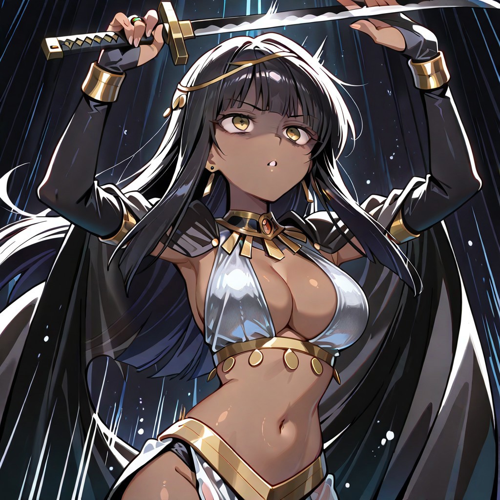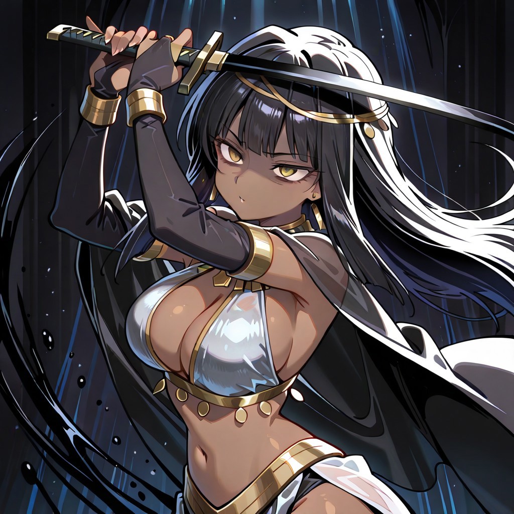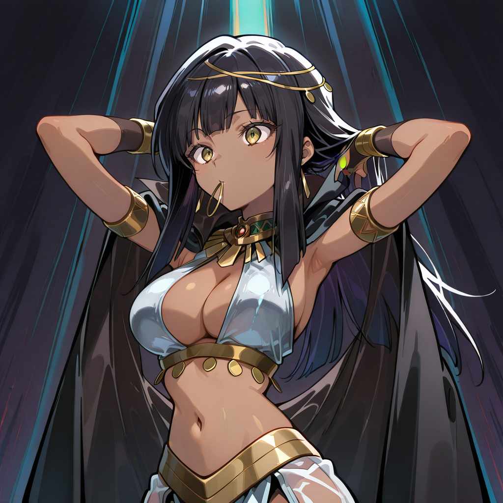 web novel dancer outfit: NEFEDANCERIL7, breasts, dark-skinned female, long hair, bangs, yellow eyes, navel, black hair, jewelry, bridal gauntlets, gold hair ornament, earrings, silver black outfit, cleavage, breasts, see-through black cape,