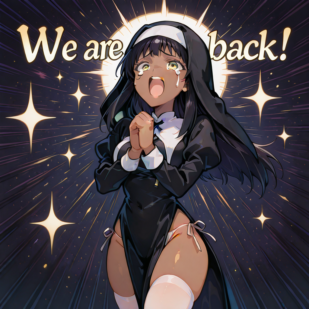 Manga Nun outfit (church nation infiltration arc): NEFENUNIL7, 1girl, nun, white highhighs, dark-skinned female, habit, yellow eyes, black hair, white side-tie panties, breasts, black footwear, long sleeves,
