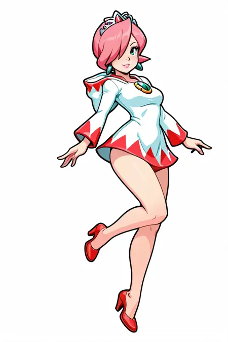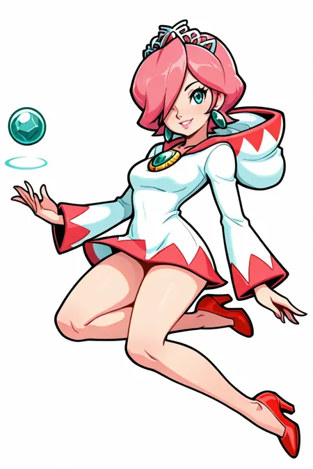 我发现有效的内容:whitemage,粉红色头发,头发遮住一只眼睛,王冠,青绿色眼睛,耳环,胸针,短裙,兜帽,红色高跟鞋,粉红色嘴唇,