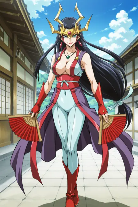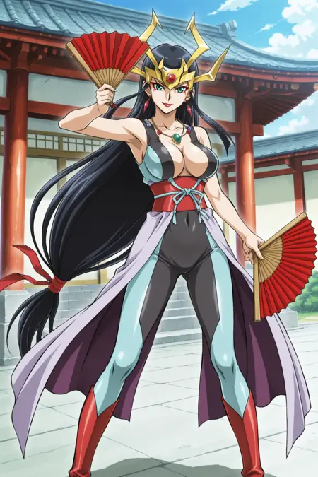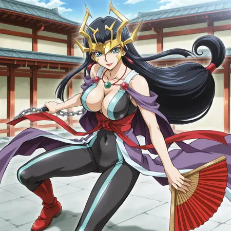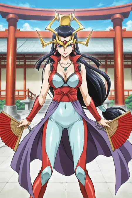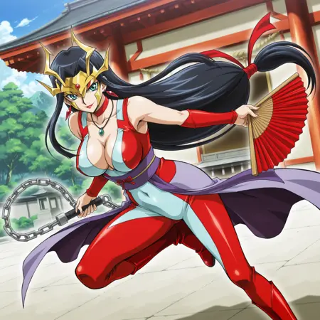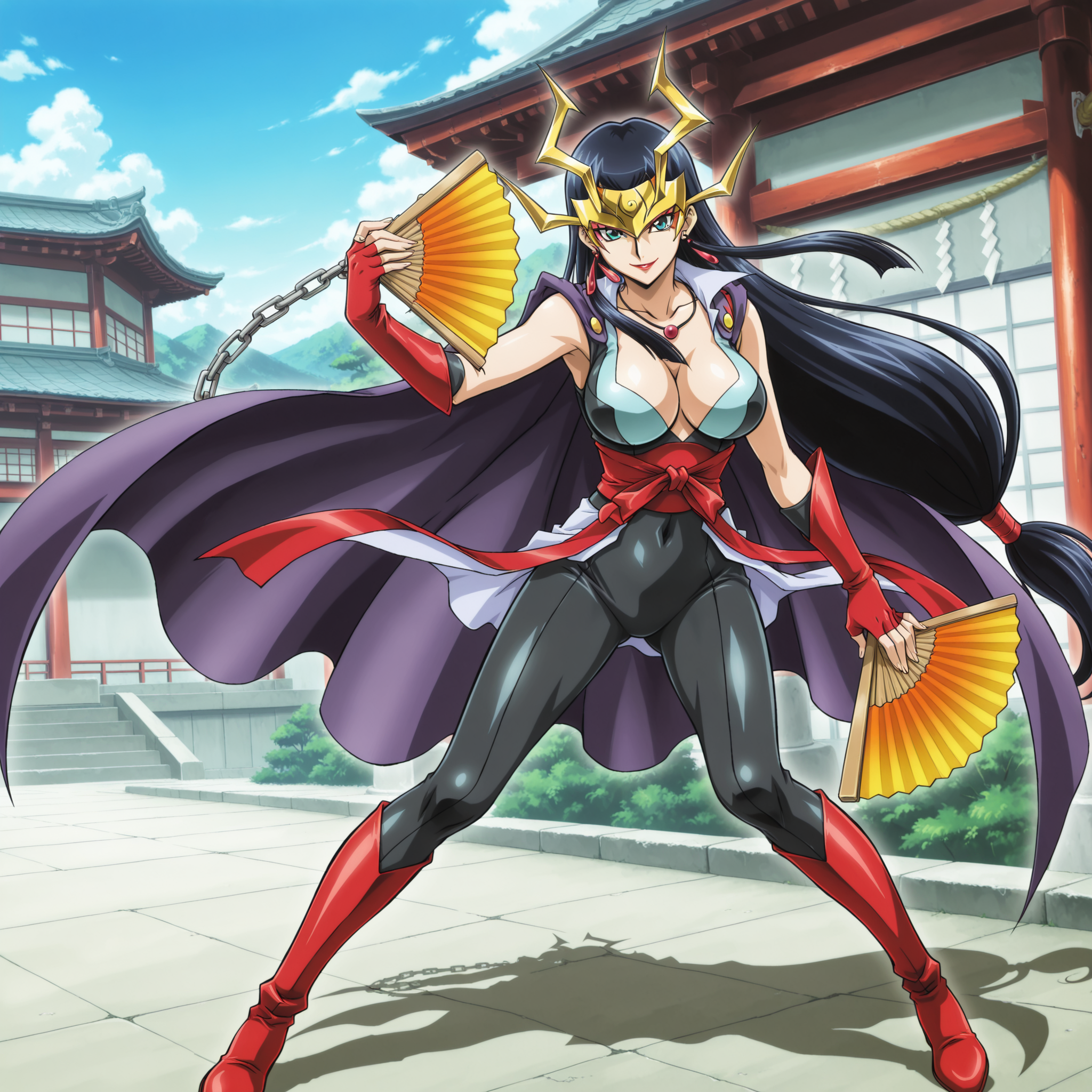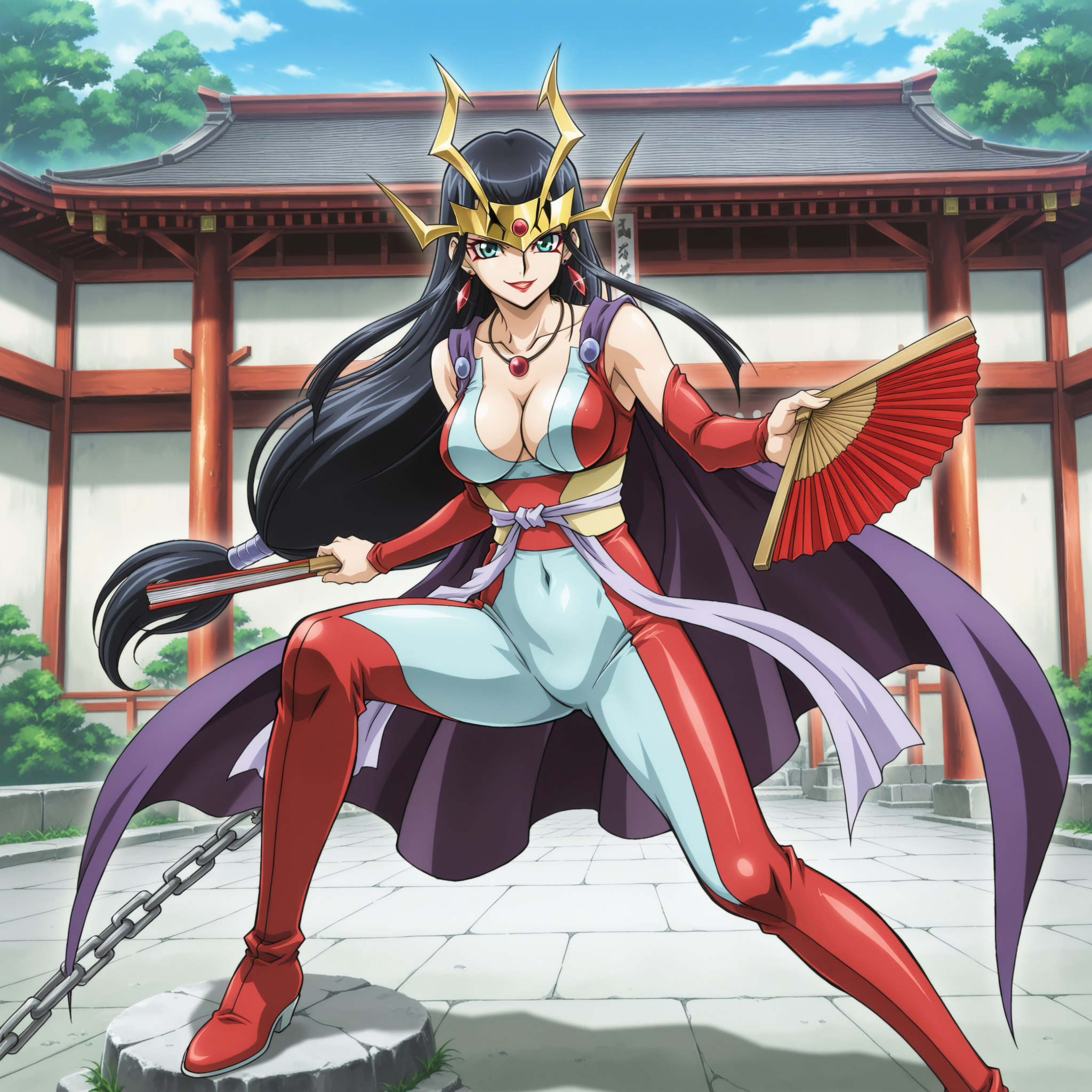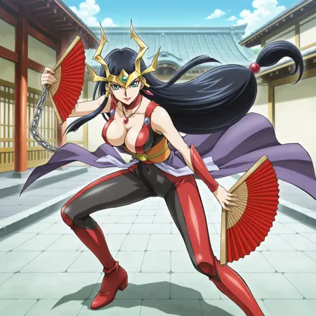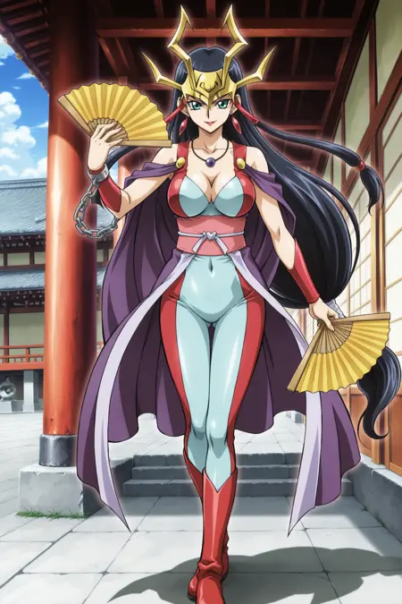 yugioh_card_style, yugioh_card_for_cyber_angel_benten, 翠绿色眼睛, 红唇, 黑发, 低扎长发, 长发, 极长发, 直发, 发饰, 耳环, 项链, 大胸部, 锁骨, 裸露肚脐, 胸部沟壑, 微笑, 裸露肩膀, 金色面具, 连体衣, 腰带, 红色丝带, 红色手套, 露指手套, 紫色斗篷, 红色长靴, 握持, 双持, 链式武器, 折扇