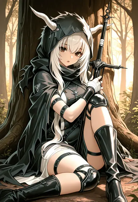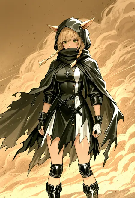 공식 복장, 무릎 부츠, 무릎 패드, 붕대 감은 손, 펜던트, 검은 드레스, 찢어진 옷, 후드 달린 망토, 팔찌