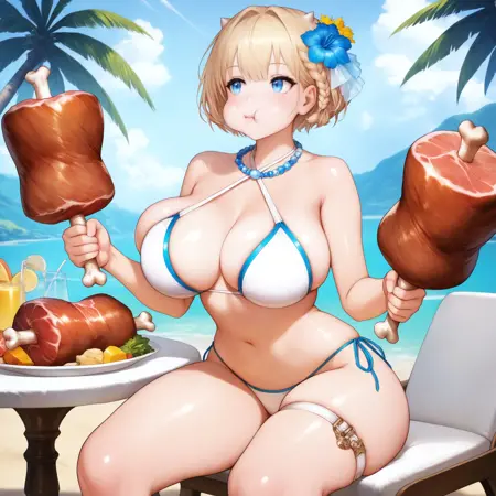 small horns, blonde hair, short hair, single braid, hair ornament, hair flower, blue eyes, blue necklace, pearl necklace, criss-cross halter, white bikini, side-tie bikini bottom, string bikini, white thigh strap, flower bracelet, footwear flower, white footwear, flip-flops,