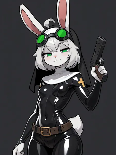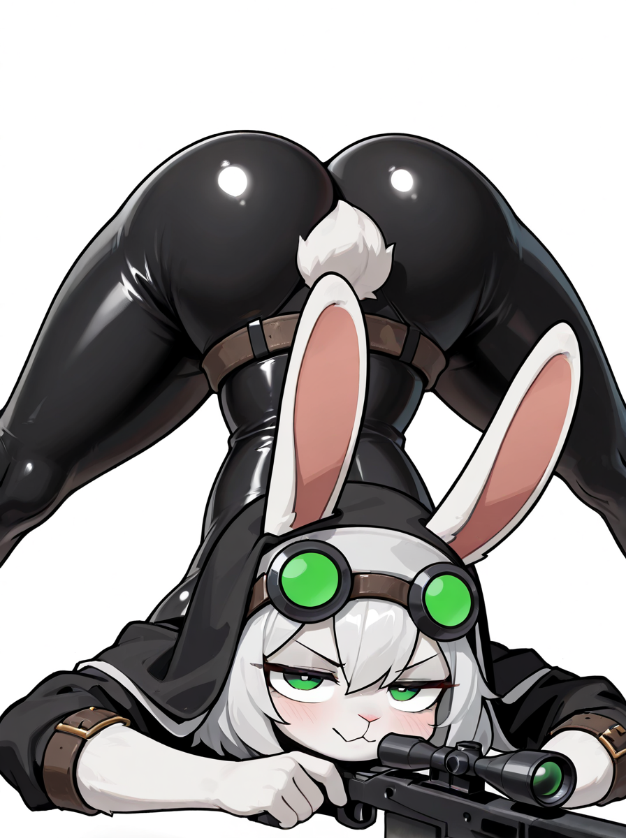 Triggers: lagomorph, anthro, female, white hair, short hair, green eyes, narrowed eyes, white fur, athletic, small breasts