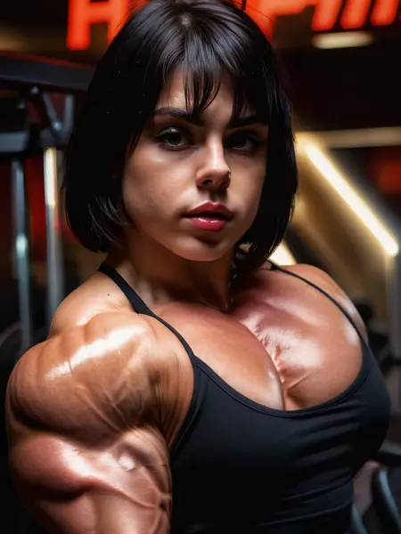 A LoRA for generating very muscular bodybuilder women with flat pecs/small breasts.