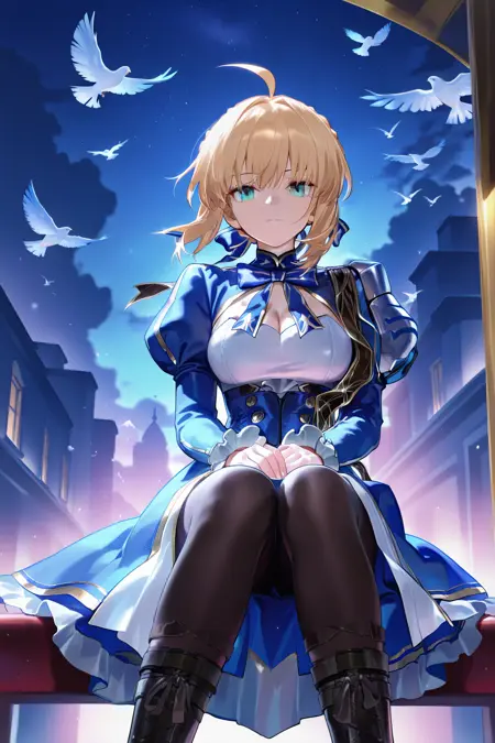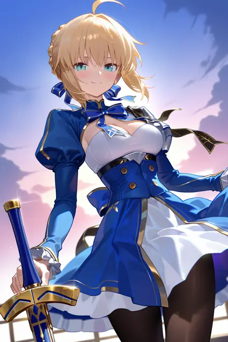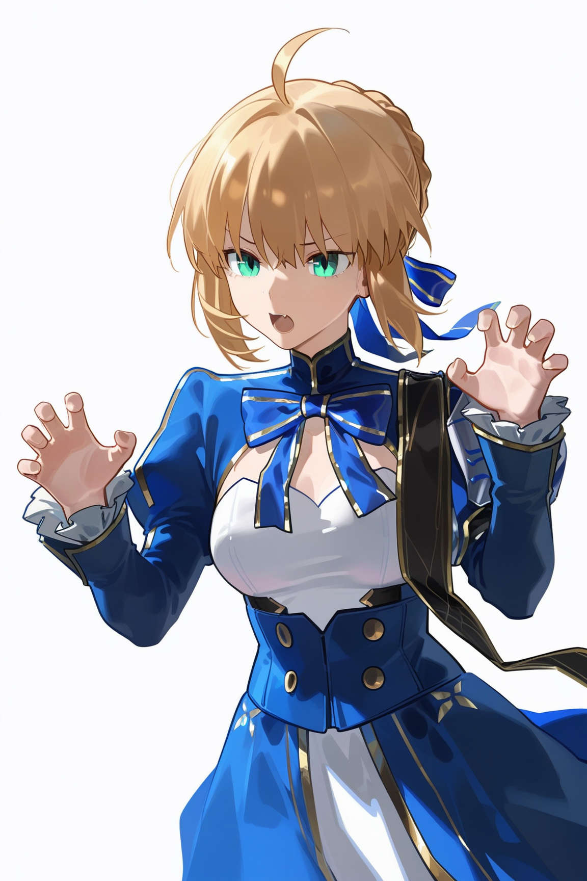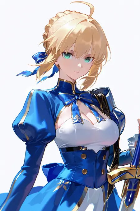 saber \(honkai star rail\) \(fate\), 1girl, green eyes, saber \(fate\), blonde hair, ahoge, dress, blue ribbon, white background, breasts, ribbon, long sleeves, braid, hair bun, shoulder armor, puffy sleeves, blue dress, hair ribbon, juliet sleeves, cleavage, bow, braided bun, blue bow,