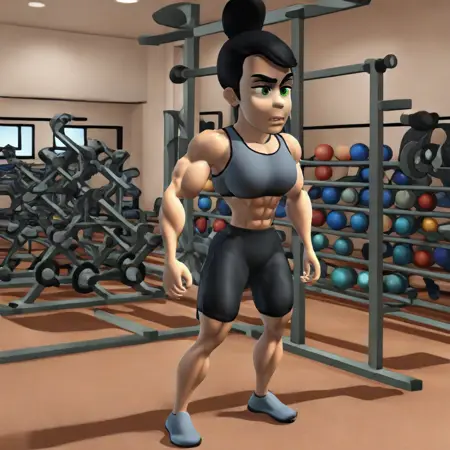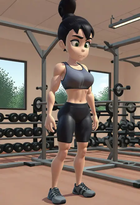 수지: A_V_J_N, 탑 노트, 검은 머리, 근육질, 스포츠 브라, 자전거 반바지, (근육질 부분의 가중치를 줄일 필요가 있을 수 있음)