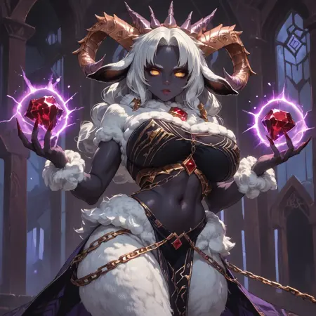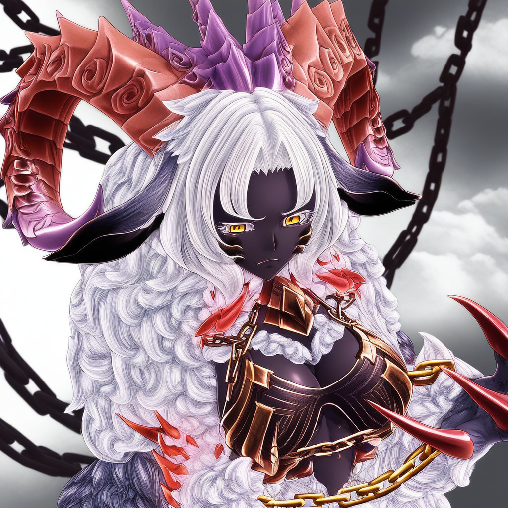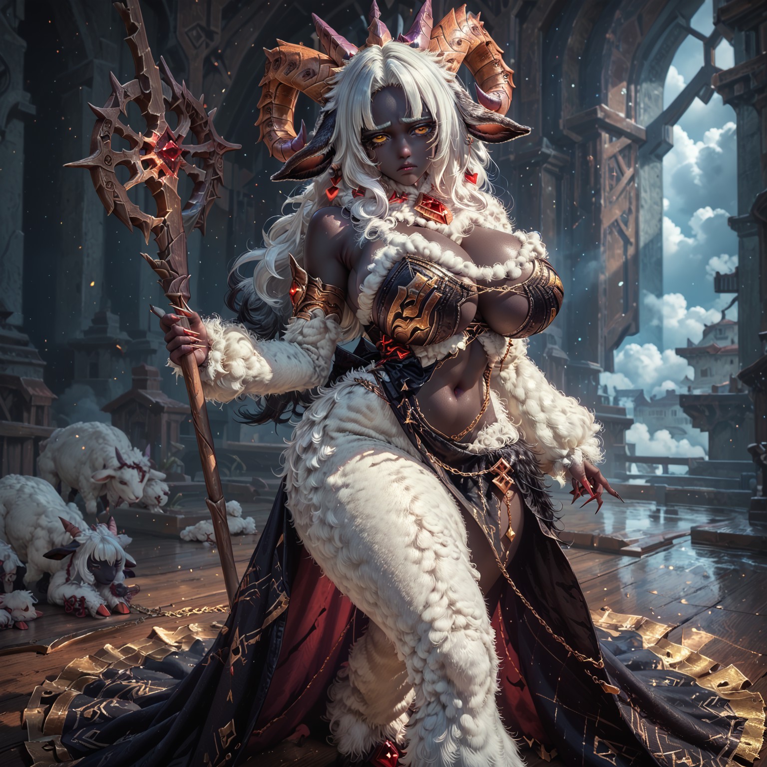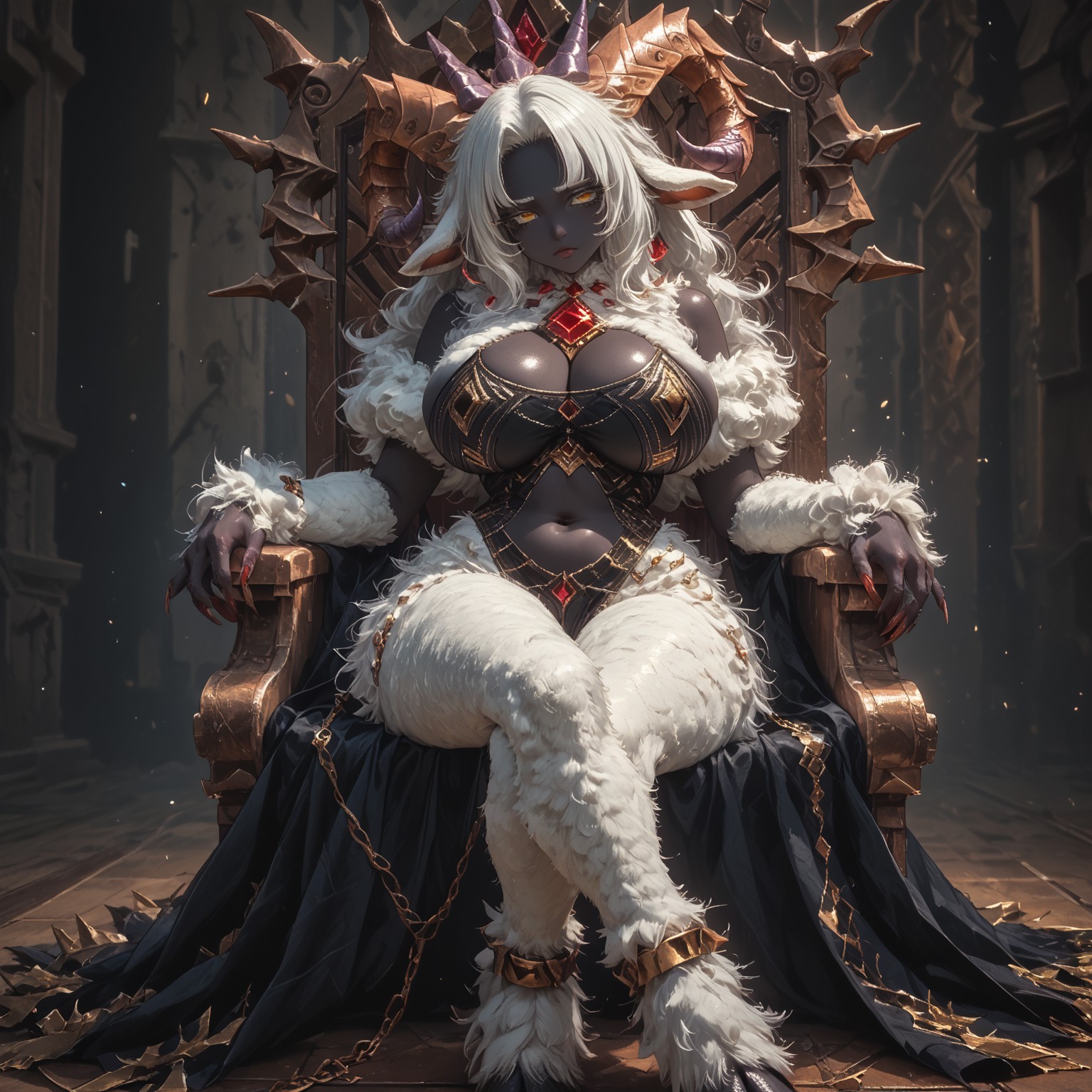 white fur, white hair, black skin, black ears, sheep ears, breast, crown, claws, horns, chain, sheep eyes, yellow eyes, hooves, sheep legs