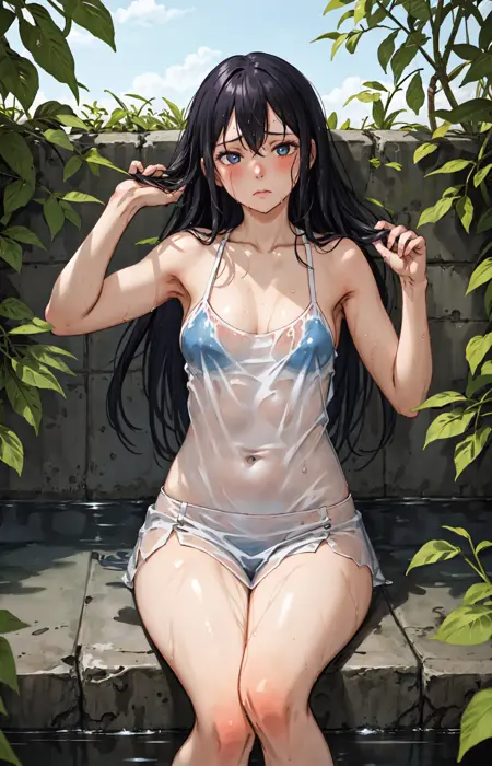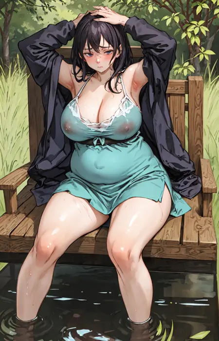 best quality, detailed background, girl, spring,shy,solo, breath, wet:0.6,tired, huge breasts, sagging breasts, potbelly:0.4
