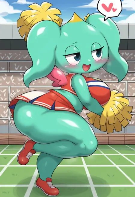 Milf_Chao, small blue body, shortstack, floating yellow heart above its head, round waterdrop-like head, twin pigtails, no hair, big eyes, blue eyes, no nose, small pink wings, short tails, mooth feet,