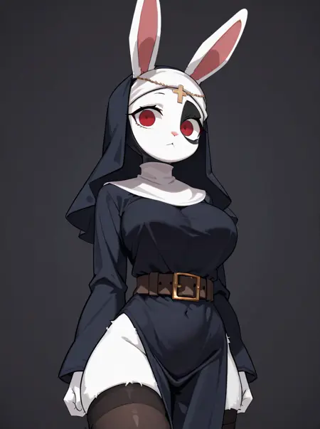 아우트핏 1: 수녀, 교복, 갈색 부츠, 검은 치마, 벨트, 허벅지 양말, 십자가 목걸이