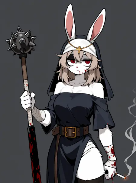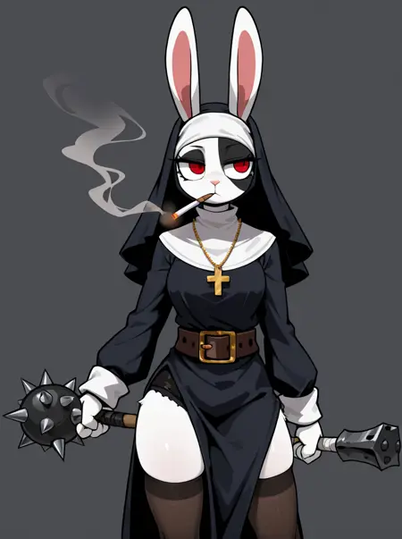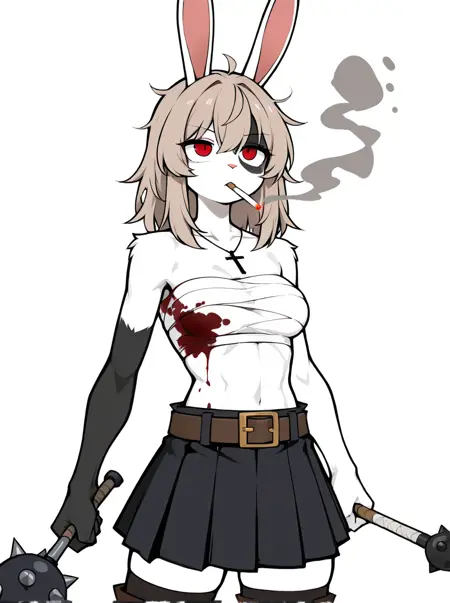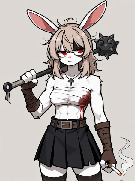 트리거: 라고모프, 앤트로, 여성, 흰 털, 이톤 얼굴, 빨간 눈, 운동적인, 담배, 흡연, 십자가 모양 머리 체인