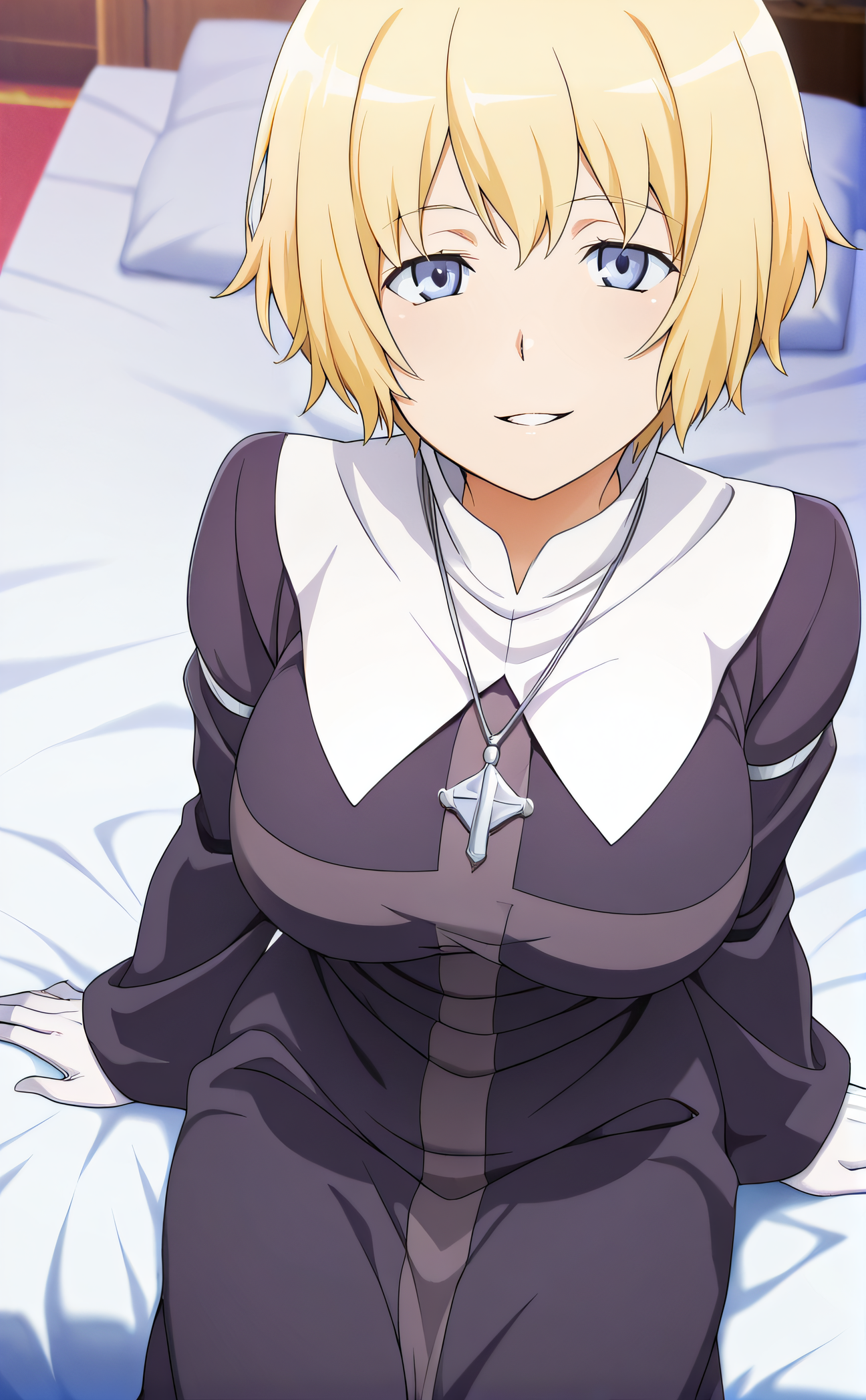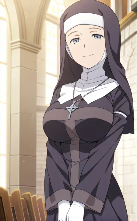 要生成她未戴面纱的修女造型,必须在负面提示中加入:(帽子,戴帽子,面纱:1.3,修女面纱:1.3,修女服,头发遮盖,发带)