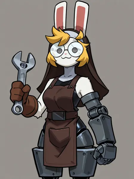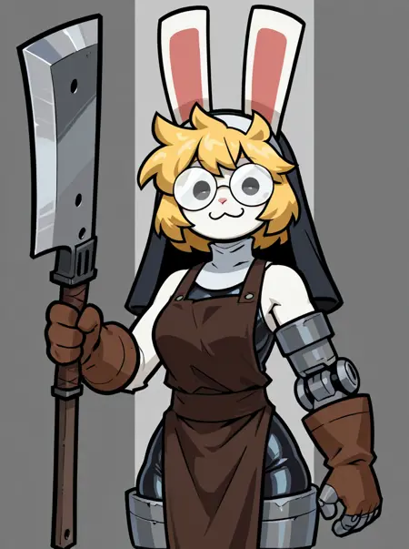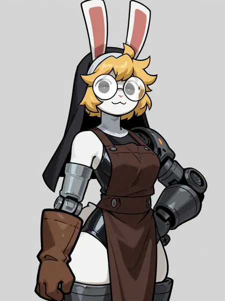 触发条件:兔形动物、拟人、女性、白色毛发、金色头发、凌乱头发、圆框眼镜、不透明眼镜、灰色眼睛、小眼睛、左臂金属义肢、左臂假肢、金属腿部、假肢腿部