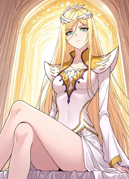 Renxue, 1girl, solo, long hair, blonde hair, straight hair, side bangs, blue eyes, white feather crown, silver tiara,