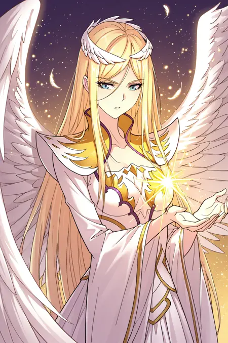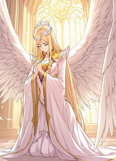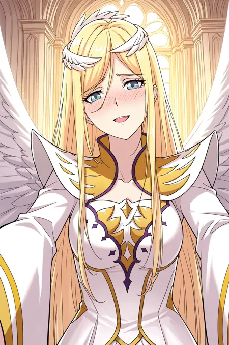 angelic_saint, white and gold armor, white dress, golden trim, purple detailing, wing-shaped pauldrons, armored bust, long sleeves, white gloves,