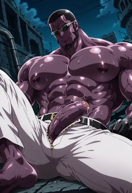 Gold-rimmed sunglasses, crew cut, black hair, Trimming sideburns, sideburns, whiskers, Dark purple skin, Metal skin,
