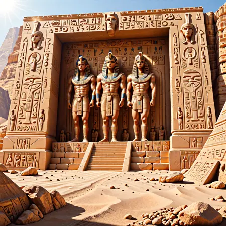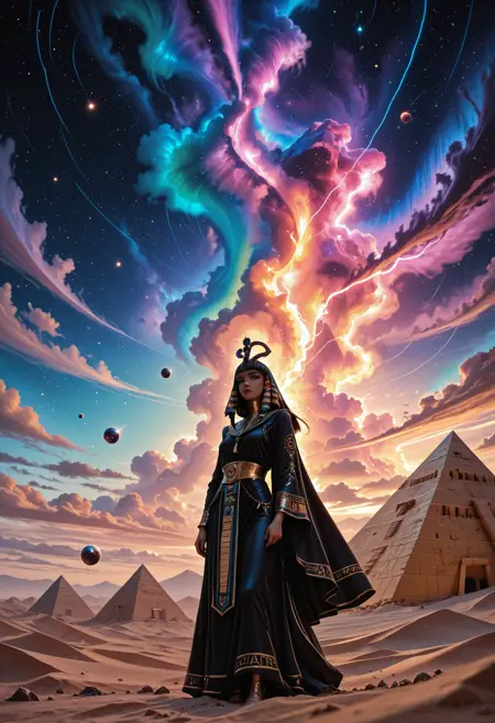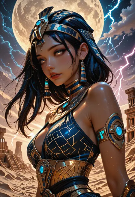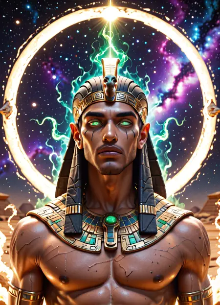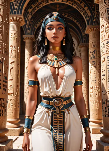 ThemeTrigger Words egypt, ancient egypt, egyptian, pharaoh, pyramid, temple, hieroglyphs, desert , nile, god/goddess, anubis, bastet, horus, seth, osiris, isis, apophis, thot, mummy, bandages, wrapped, glowing eyes, priestess, high priestess, royal headdress, ornate jewelry, golden jewelry, lapis lazuli, turquoise gems, ornate necklace, arm cuffs, headpiece, temple columns, hieroglyphic pillars, pyramids in background, ancient ruins, cinematic lighting, divine aura, mystical, desert sunset, dramatic lighting, khopesh, spear, bronze