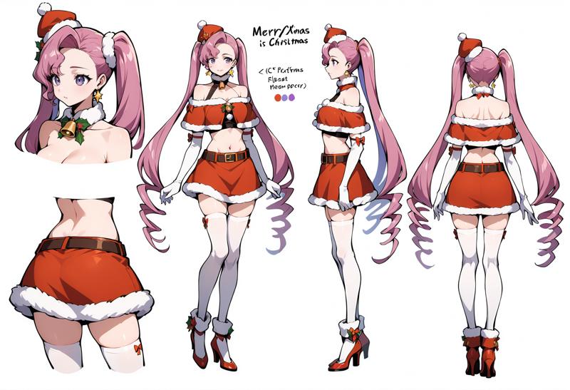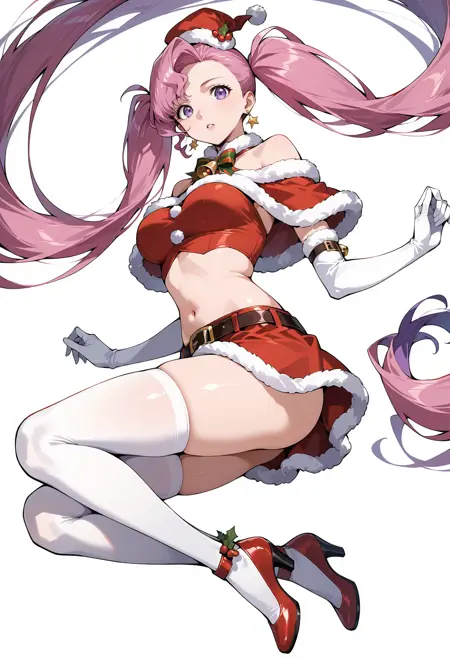 1girl, 紫の目, 長い髪, ピアス, 手袋, ツインテール, ジュエリー, ストッキング, スカート, 白い手袋, 帽子, ハイヒール, 肩出し, 紫の髪, おへそ, ピンクの髪, 腹出し, 赤いスカート, ベルト, 前髪, 白いストッキング, ベル, ファーの縁取り, ミニハット, 胸, とても長い髪, サンタコスチューム, 別のコスチューム, サンタ帽, 赤い靴, 赤い頭飾り, クロップトップ, 肘までグローブ, つやつやした髪, ミニスカート, 星形のピアス, 肩出し