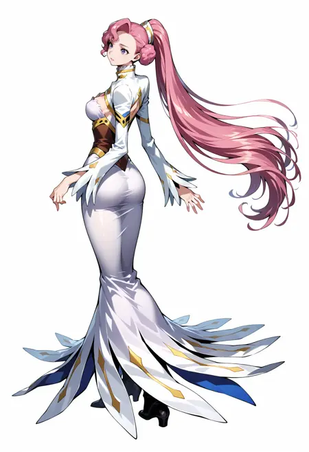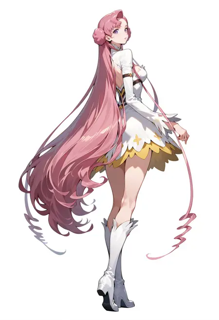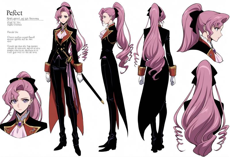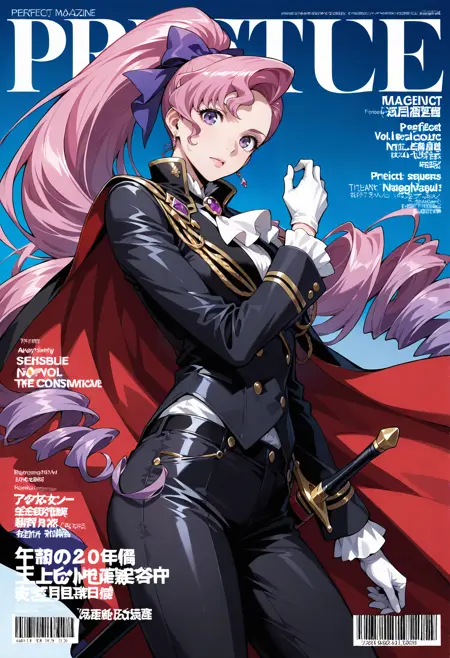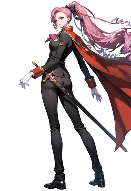 1girl, 長い髪, 手袋, 紫の目, ピンクの髪, 白い手袋, ジュエリー, ピアス, パンツ, フォーマル, とても長い髪, ポニーテール, ボウタイ, ケープ, アスコット, 紫の髪, スーツ, 髪のボウタイ, 黒いパンツ, リボン, 長い袖, ドリルヘア, 高いポニーテール, 黒い靴, 靴, 髪のリボン, シース
