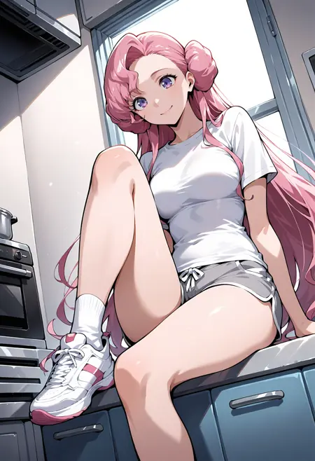 1girl, ドーナツ型の髪の結び目, ピンクの髪, 長い髪, 髪の結び目, ドレス, 紫の目, 二重の髪の結び目, 長い袖, とても長い髪, ボタン, フリル
