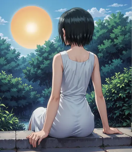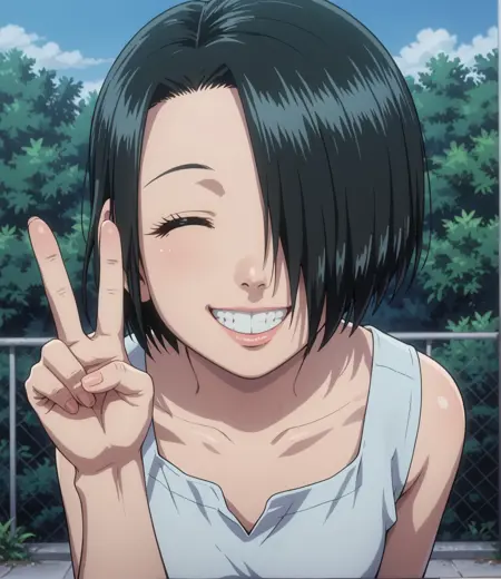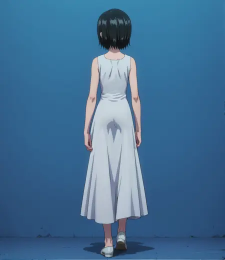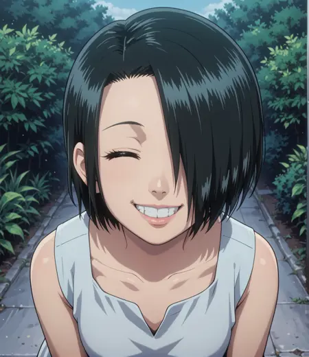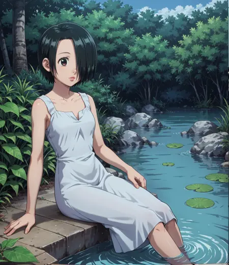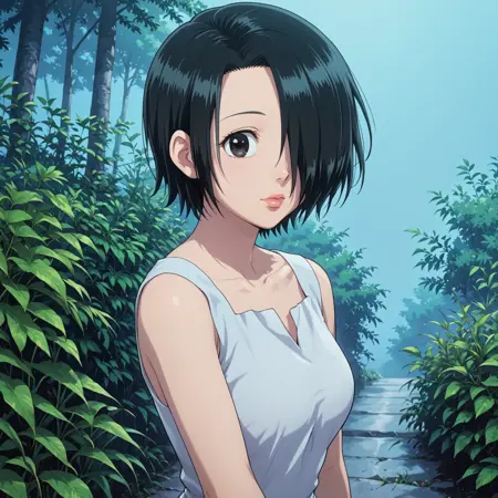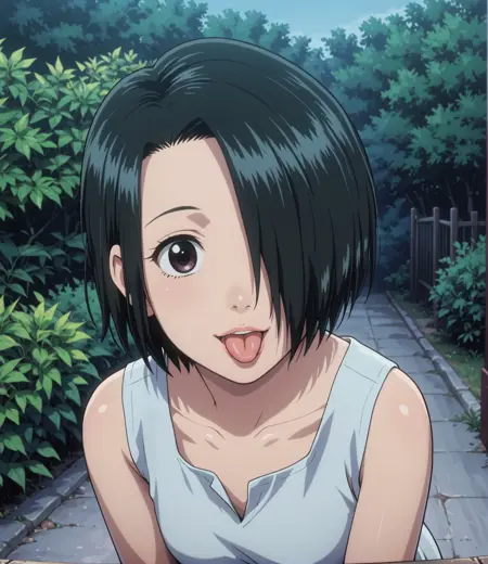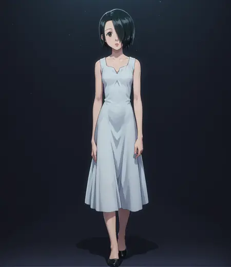 AmanaHxH, short hair, black hair, hair over one eye, dress, Amana, lips,